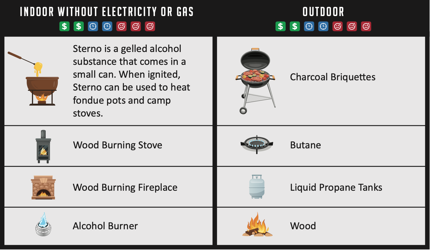 safe and approved alternative methods for cooking, such as camp stoves, portable butane stoves or outdoor cooking equipment specifically designed for indoor use.Be cautious of dented, deformed or bloated cans, as this can be an indication of spoiled food that can be deadly.