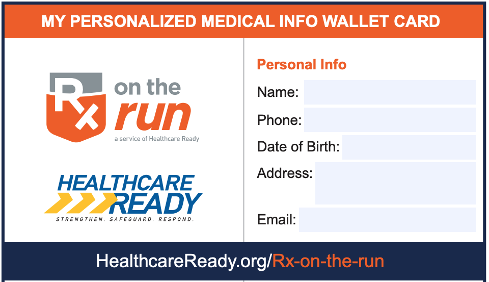 Rx on the Run is a free, customizable wallet card provided by Healthcare Ready that allows individuals to document their essential medical information, including prescriptions, allergies, and emergency contacts. This tool is especially useful during emergencies or natural disasters when access to medical records may be limited. By having this information readily available, individuals can ensure continuity of care and assist healthcare providers in delivering appropriate treatment.