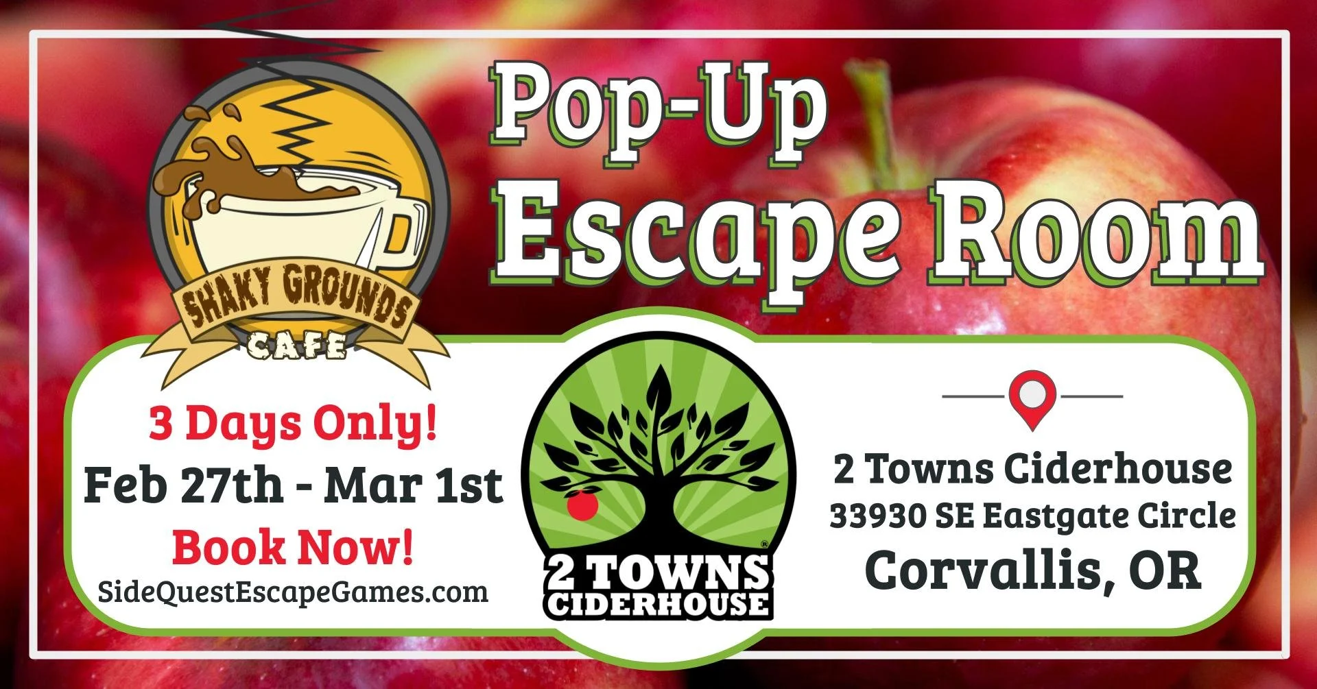 Shaky Grounds Cafe is popping up in Corvallis, Oregon for the first time! Join us at 2 Towns Ciderhouse from February 27–March 1 for an award-winning mobile escape room experience focused on earthquake preparedness and emergency readiness.