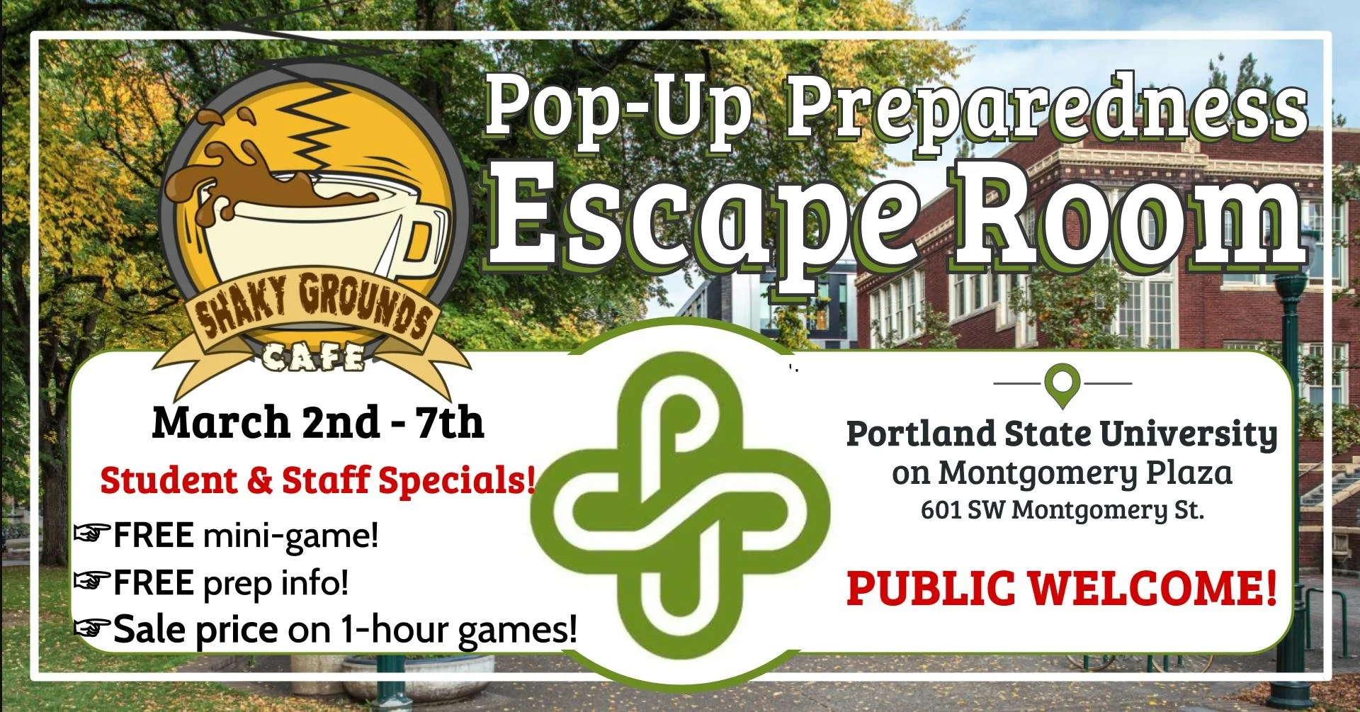Students and staff can try our free 5-minute mini-games, provided by the PSU Emergency Management Team. Stop by, play a few quick challenges, and pick up free emergency preparedness materials.