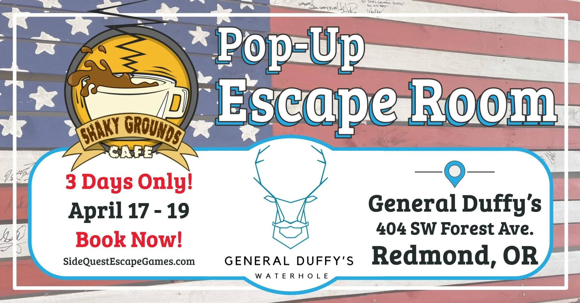 Shaky Grounds Cafe is popping up in Redmond, Oregon for the first time! Join us at General Duffy’s Waterhole from April 17th to 19th for an award-winning mobile escape room experience focused on earthquake preparedness and emergency readiness.