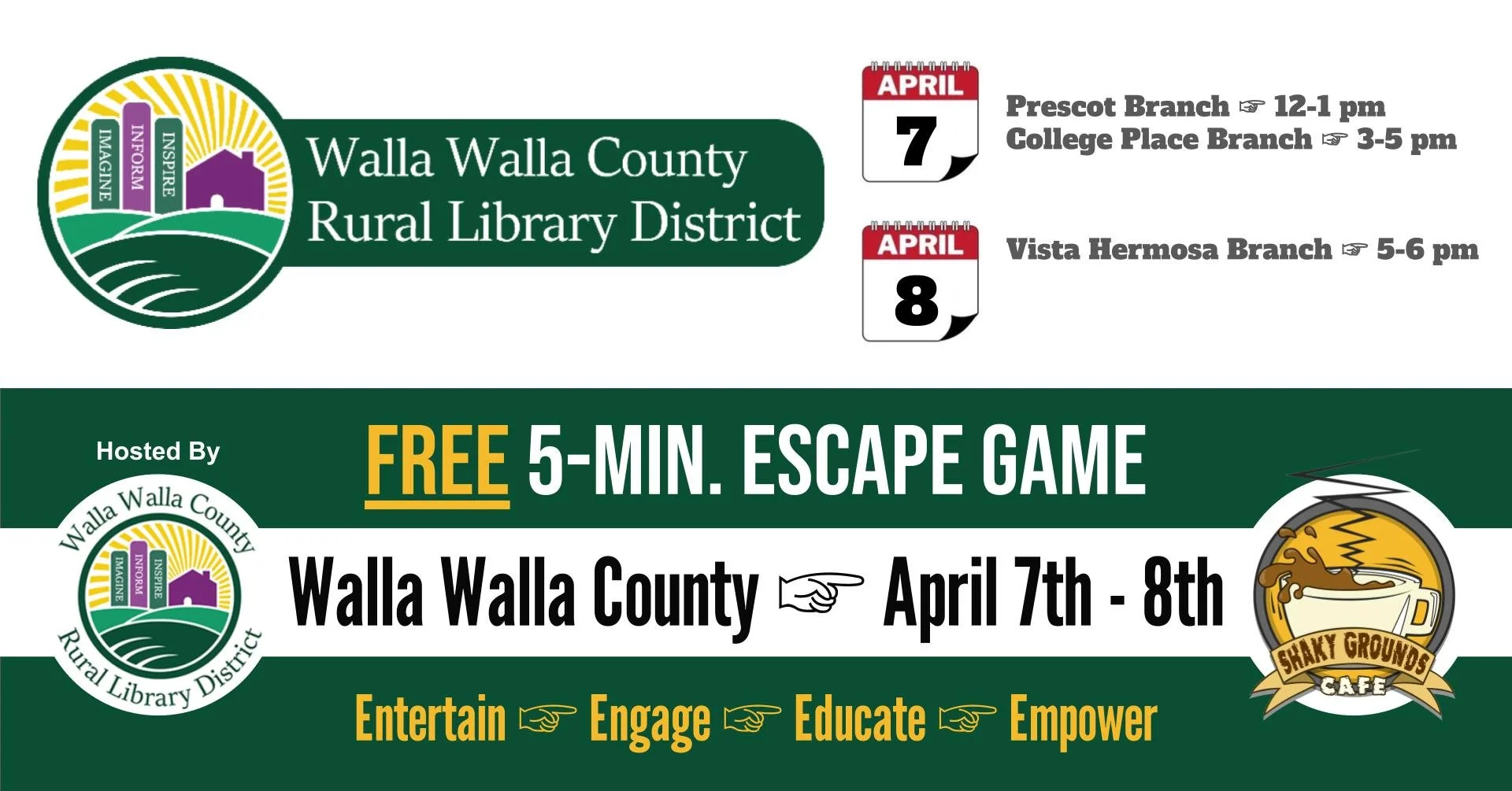April 7–8, we’re popping up across the Walla Walla County Rural Library District with our fast, hands-on 5-minute mini escape game — a quick hit of fun that shows how interactive gameplay can build real-world preparedness skills.